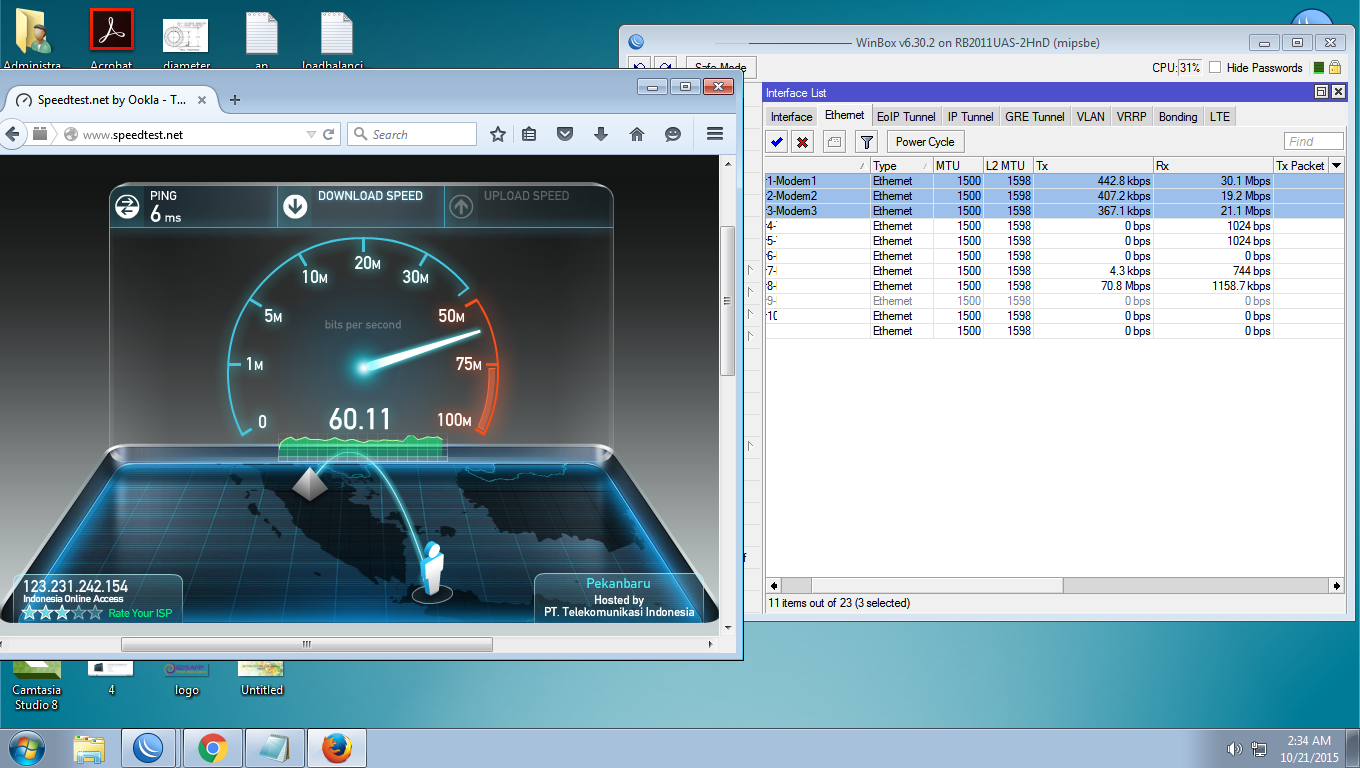 ohya lupa saya … ini saya coba di versi 6.30.2 mikrotik, ini bukti saya sendiri loh saya bisa menghasilkan bw 20mbps x 3 dengan hasil = 60mbps. saya tidak tahu teori konspirasi bahwa loadbalance 20+20+20=20+20+20 tapi nyatanya bisa kaya bonding 20+20+20=60