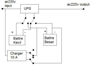 Prinsip dasarnya jika listrik idup, maka ups berjalan dengan normal dan battre besar akan di cas dengan charger 10A, karena otomatis jika batre penuh akan memutuskan hub dengan batre, jika listrik mati maka otomatis relay akan terputus dan menghubungkan batre 100 amper dengan ups, sementara charger di putuskan hubungan ke batre,